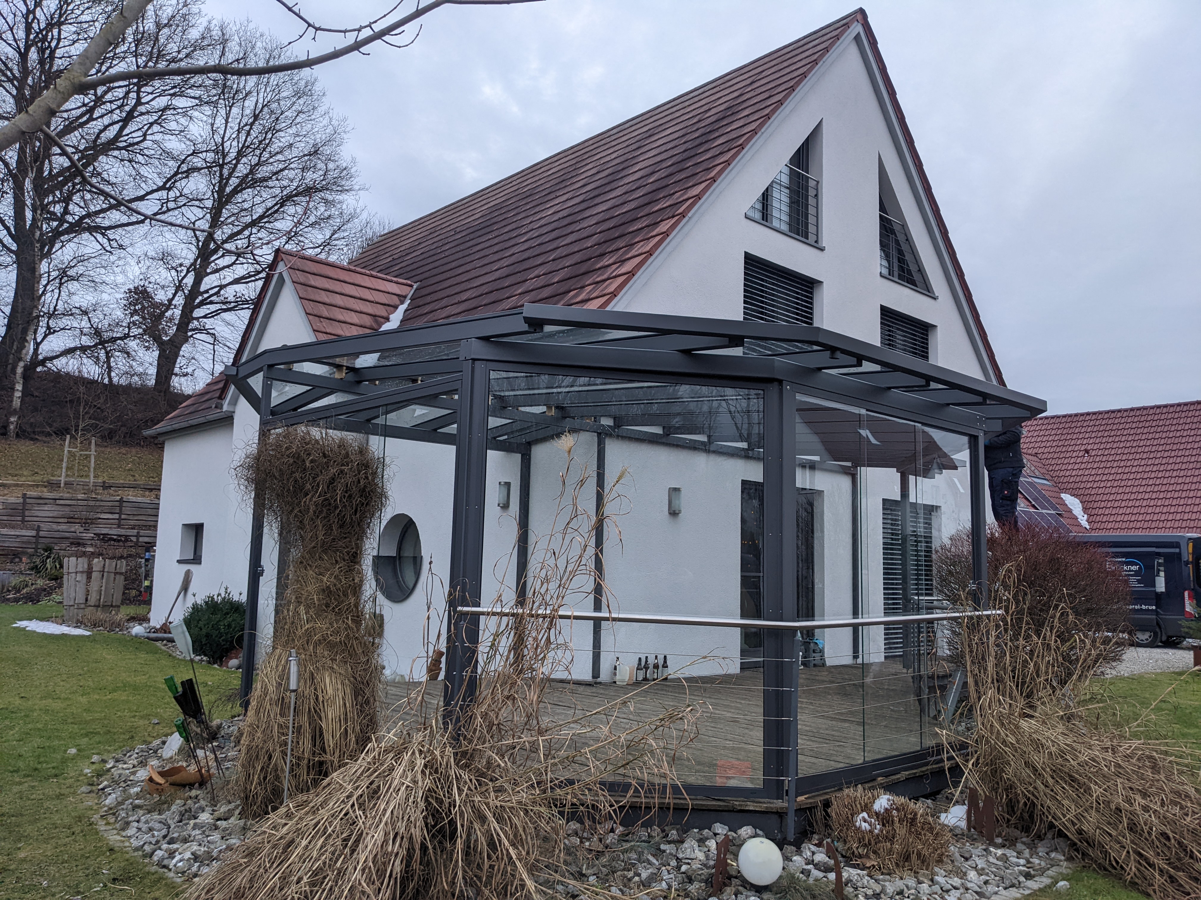 Die Terrassenüberdachung entsteht aus komplett eigener Herstellung inkl. Planung, CAD-Zeichnung, Fertigung und Montage mit Glasverlegung bis 5,2 m an einem Stück. Sogar das Fundament betonieren wir auf Kundenwunsch.